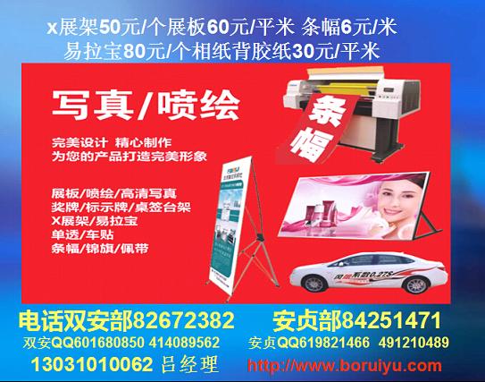 我公司制作易拉寶、X展架、拉網、燈片、燈箱布、網格布、單透、高光相紙、掛軸、車帖等寫真噴繪產品,進口機器制作,質優(yōu)價廉,歡迎惠顧!寫真輸出(燈片 全透片 海報背膠 相紙),噴繪輸出(網格布 燈布 車身貼),制作 易拉寶 X架 拉網展架 電腦刻字,KT板,大型活動,及各類展版噴繪,寫真,展板,展架,易拉寶,X展架,,廣告條幅。